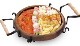 De smulsteen wordt gevuld met gemarineerd vlees, groente en aardappel. Er zijn 6 smulsteen gerechten, 4 smulstenen met vlees, groente en aardappel en 2 smulstenen met 3 soorten vlees.